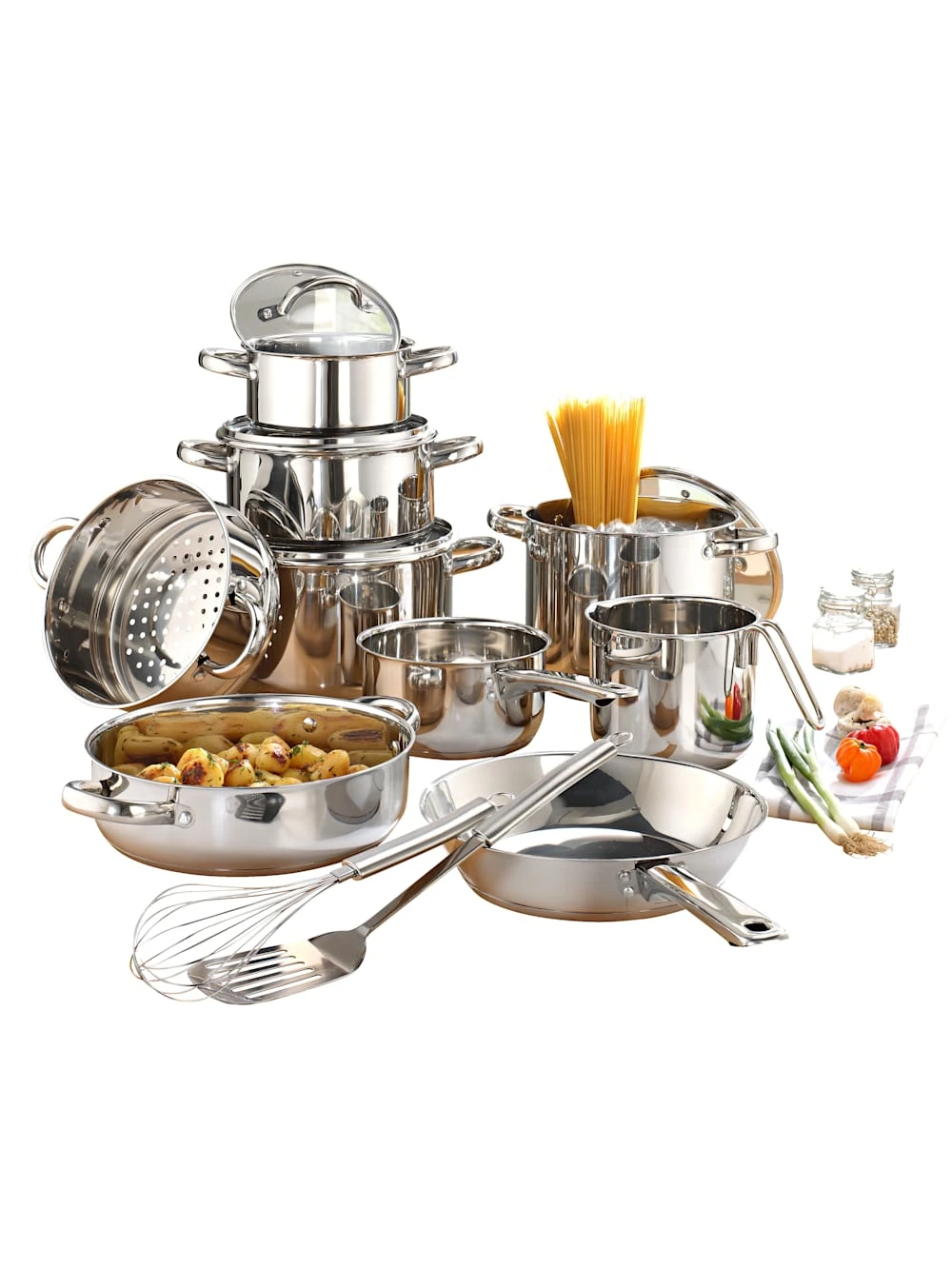 15tlg. Topfset ‚Montreal‘ von GSW. Aus hochwertigem Edelstahl rostfrei, außen und innen hochglanzpoliert. Mit handfreundlichen Kaltmetallgriffen und Glasdeckel mit Dampfaustrittsöffnung. Energiesparender Kapselboden. Für alle Herdarten verwendbar, auch für Induktion. Backofengeeignet bis +240°C. Spülmaschinengeeignet. Bestehend aus: 1 Kochchtopf Ø 16 cm mit Glasdeckel – ca. 1,8 Liter, 1 Kochchtopf Ø 20 cm mit Glasdeckel – ca. 3,5 Liter, 1 Kochtopf Ø 24 cm mit Glasdeckel – ca. 6 Liter, 1 Brat- und Servierpfanne Ø 24 cm – ca. 2,8 Liter, 1 Bratpfanne Ø 24 cm – ca. 2 Liter, 1 Stielkasserolle Ø 16 cm – ca. 1,6 Liter, 1 Gemüsetopf Ø 20 cm mit Glasdeckel – ca. 5 Liter, 1 Dämpfeinsatz Ø 20 cm – ca. 2,8 Liter, 1 Milchtopf Ø 14 cm, sowie 1 Schneebesen und 1 Pfannenwender.