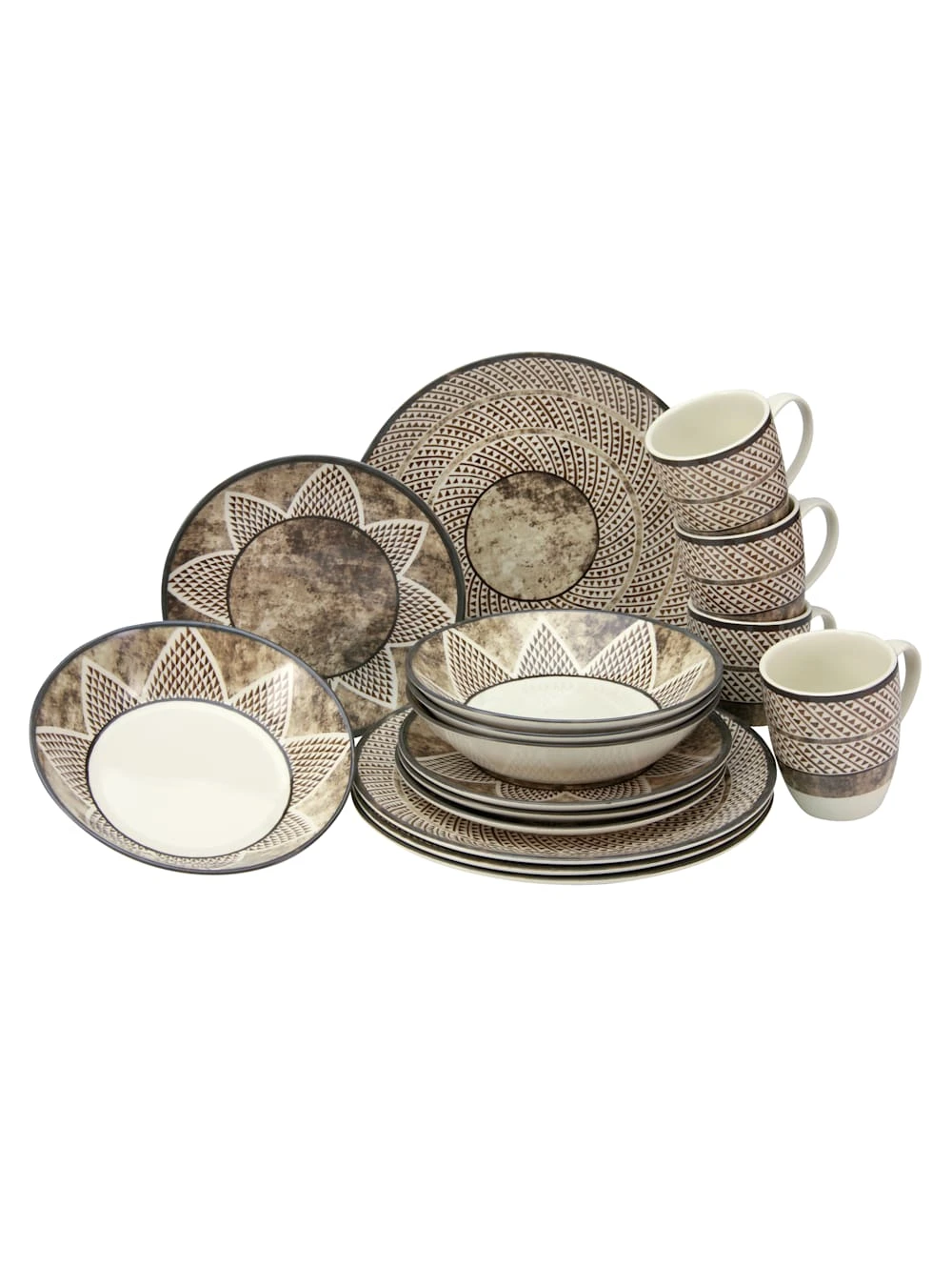 16tlg. Kombiservice Africa. Aus hochwertigem Steingut. Mit afrikanischen/orientalischen Motiven. Spülmaschinen- und mikrowellengeeignet. Set enthält: 4 Speiseteller ca. Ø 26 cm l 4 Dessertteller ca. Ø 21 cm 4 Kaffeebecher ca. 30 cl 4 Müslischalen ca. Ø 21 cm Material: Steingut.