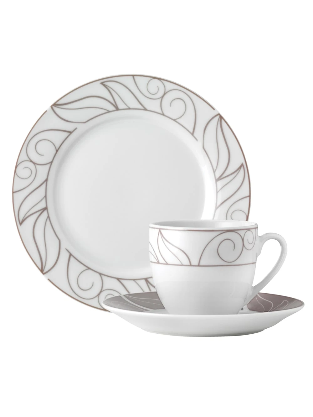 18tlg. Kaffeeservice ‚Grenoble‘. Runde Form. Weiß mit einem Dekor in braun-grau. Spülmaschinen- und mikrowellengeeignet. Material: Porzellan. Bestehend aus: 6 Obertassen (23,0 cl), 6 Untertassen (15,0 cm) und 6 Dessertteller (19,0 cm).