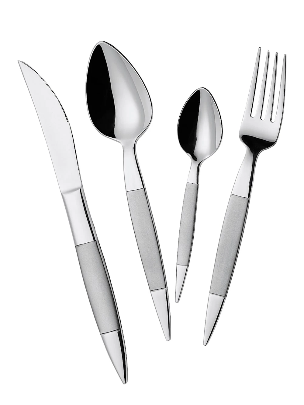 Grazil geformte 30tlg. Besteckgarnitur ‚Miami‘ von Mulex. Die stabförmigen Griffe liegen dank ihrer abgerundeten Kanten angenehm in der Hand. Die Teilsatinierung ist nicht nur eine optische Raffinesse, sondern erleichtert auch den sicheren Griff. Gefertigt aus hochwertigem Chrom-Edelstahl rostfrei 18/0. Wir empfehlen das Spülen von Hand. Für 6 Personen. Bestehend aus: 6 Messer mit Wellenschliffklingen, 6 Gabeln, 6 Löffel, 6 Kaffeelöffel und 6 Kuchengabeln.