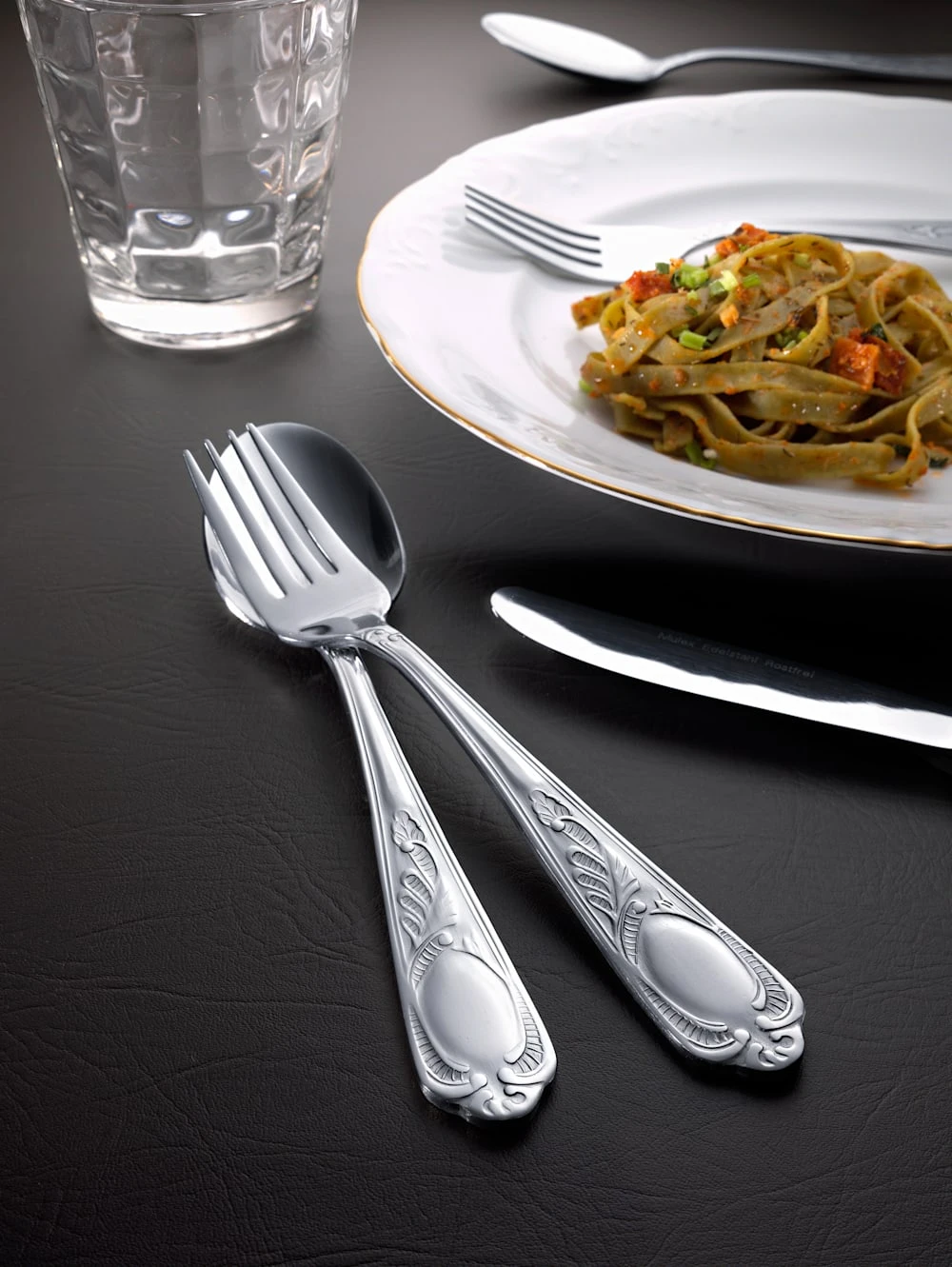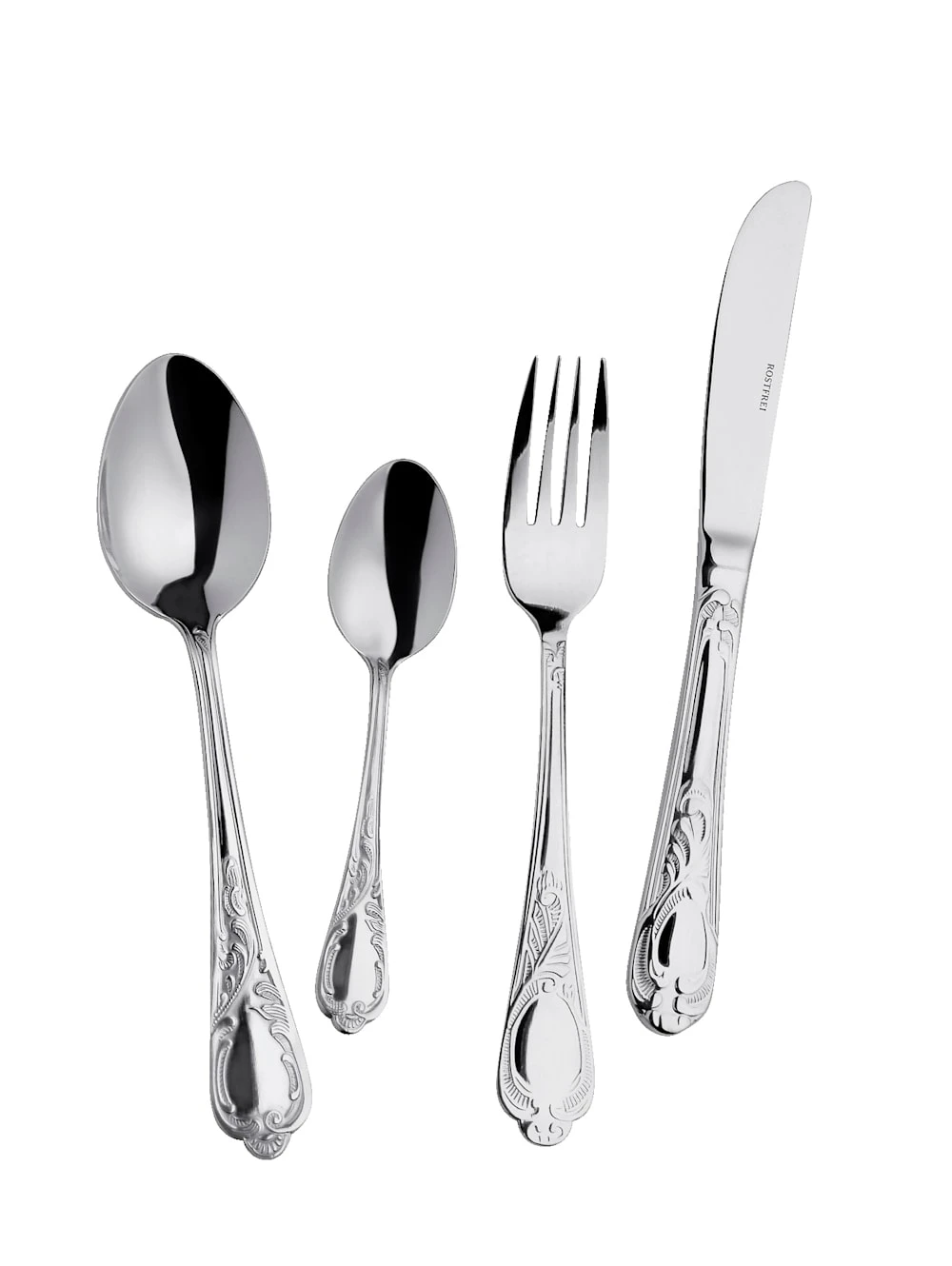 30tlg. Besteckgarnitur ‚Rococo‘ von Mulex. Zeitreise in eine andere Epoche. Dieses klassische und zeitlose Traditionsbesteck erfreut sich immer wieder großer Beliebtheit. Die floralen Ornamente, asymmetrisch und detailverliebt gestaltet, machen das Besteck zu einem Augenschmauß. Aus hochglanzpoliertem Edelstahl rostfrei. Die geschmiedeten Massivmesser mit Wellenschliffklingen aus Spezial-Klingenstahl machen das Schneiden angenehm leicht. Spülmaschinengeeignet. Für 6 Personen, bestehend aus: 6 Messer, 6 Gabeln, 6 Löffel, 6 Kaffeelöffel und 6 Kuchengabeln.