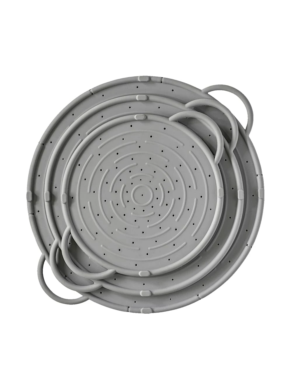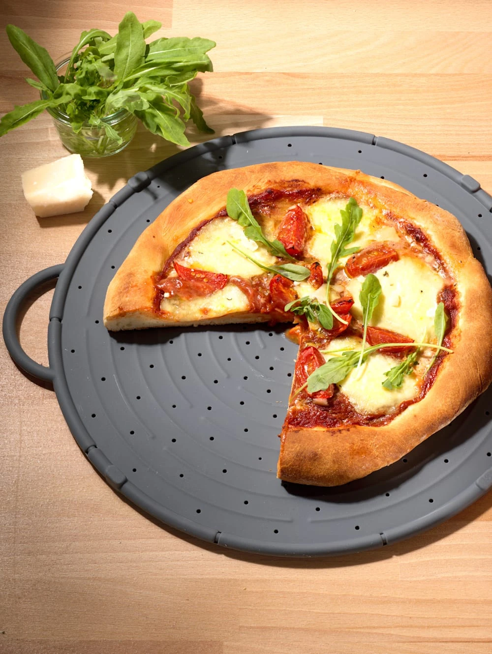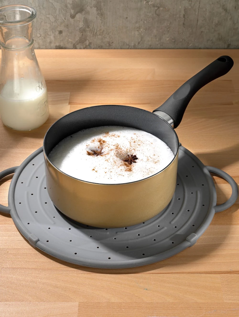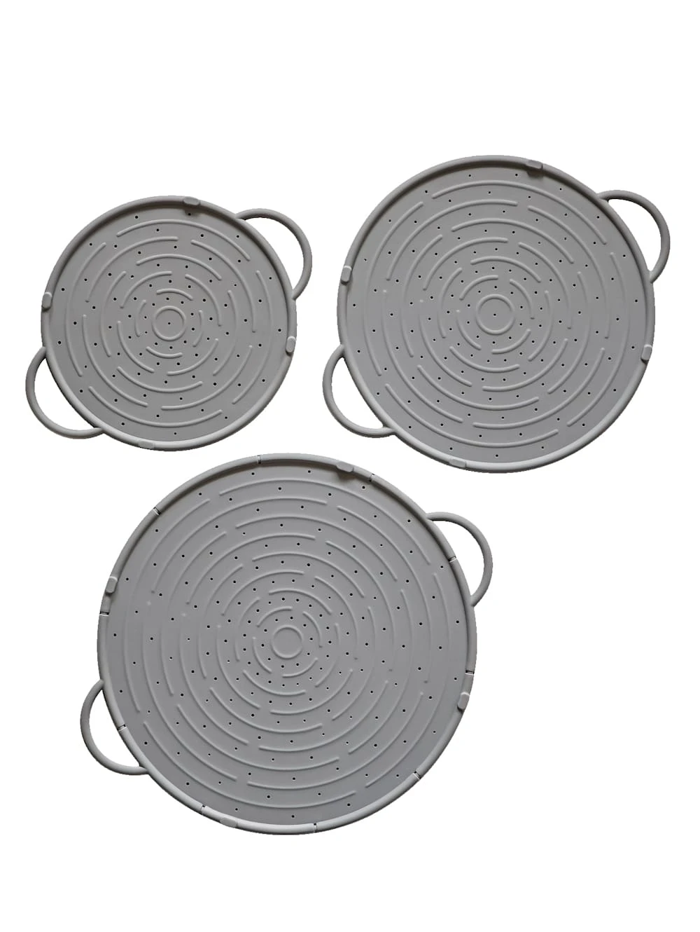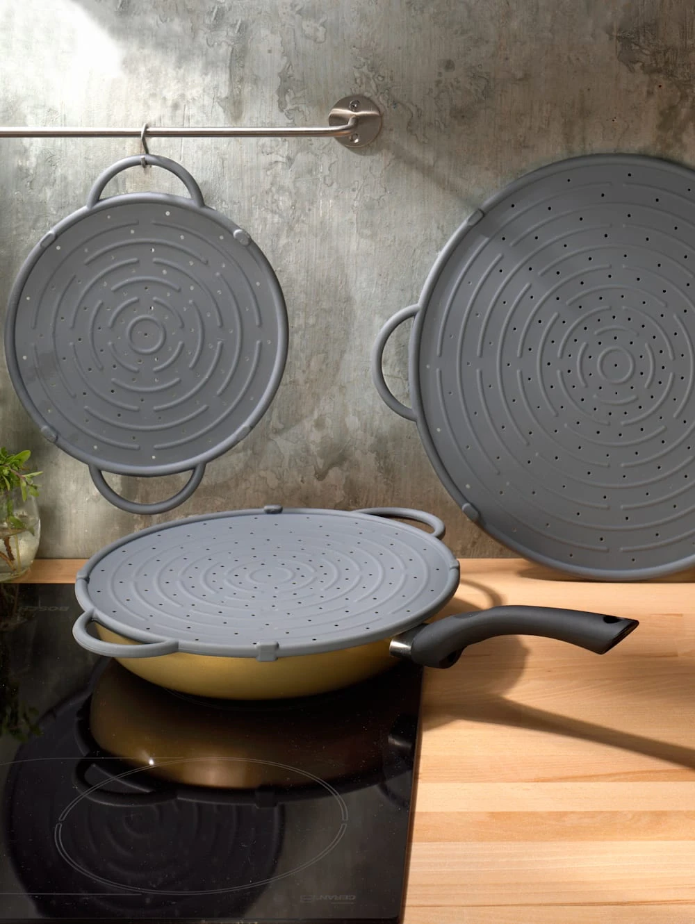 3er-Set Spritzschutz ‚Coolspritz‘. Mit diesen vielseitig einsetzbaren Küchenhelfern aus 100% Platin Silikon haben Sie 3 Produkte in einem. Sie sind echte Allrounder und eignen sich als Spritzschutz auf Pfannen oder Töpfen, als Untersetzer für Kochgeschirr oder als rundes Backofenblech für Pizza, Kekse und Aufbackbrötchen. Die hochwertige Verarbeitung, vor allem aber der eingearbeitete, robuste Metallring sorgt für Stabilität und eine einfache Handhabung. Zudem werden die Griffe nicht heiß. Der Spritzschutz ist temperaturbeständig zwischen Temperaturen von -40°C bis +230°C. Spülmaschinengeeignet. Im Set je 1 Stück mit den Maßen 21 cm, 26,5 cm und 31 cm.