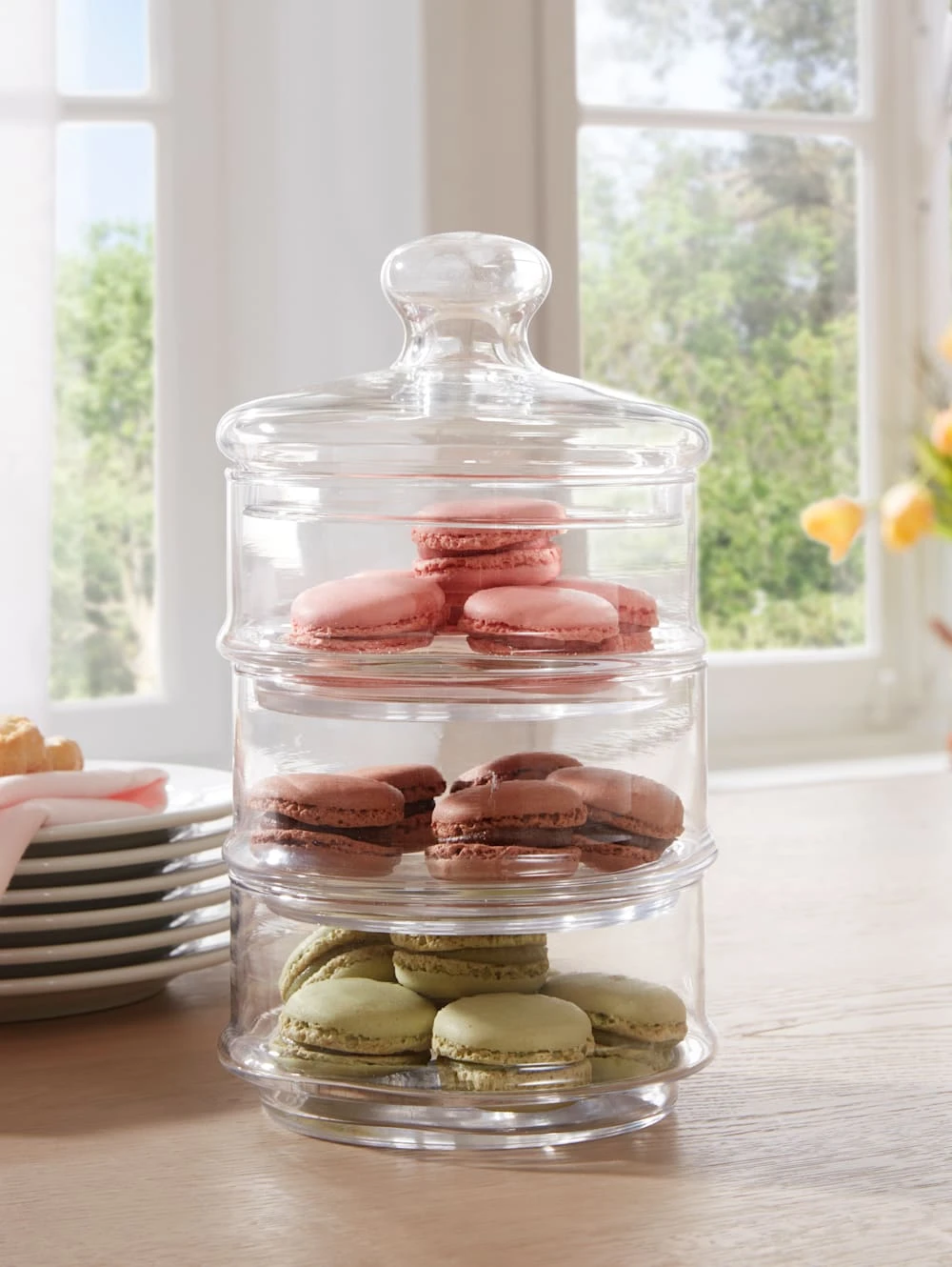 3tlg. Vorratsdose aus Glas in tollem Etagen-Design. Ideal zum Aufbewahren sowie Servieren von Gebäck und anderen Köstlichkeiten. Auch eine schöne Deko- oder Geschenkidee. Spülmaschinengeeignet. Maße ØxH ca.: 13 x 22 cm.