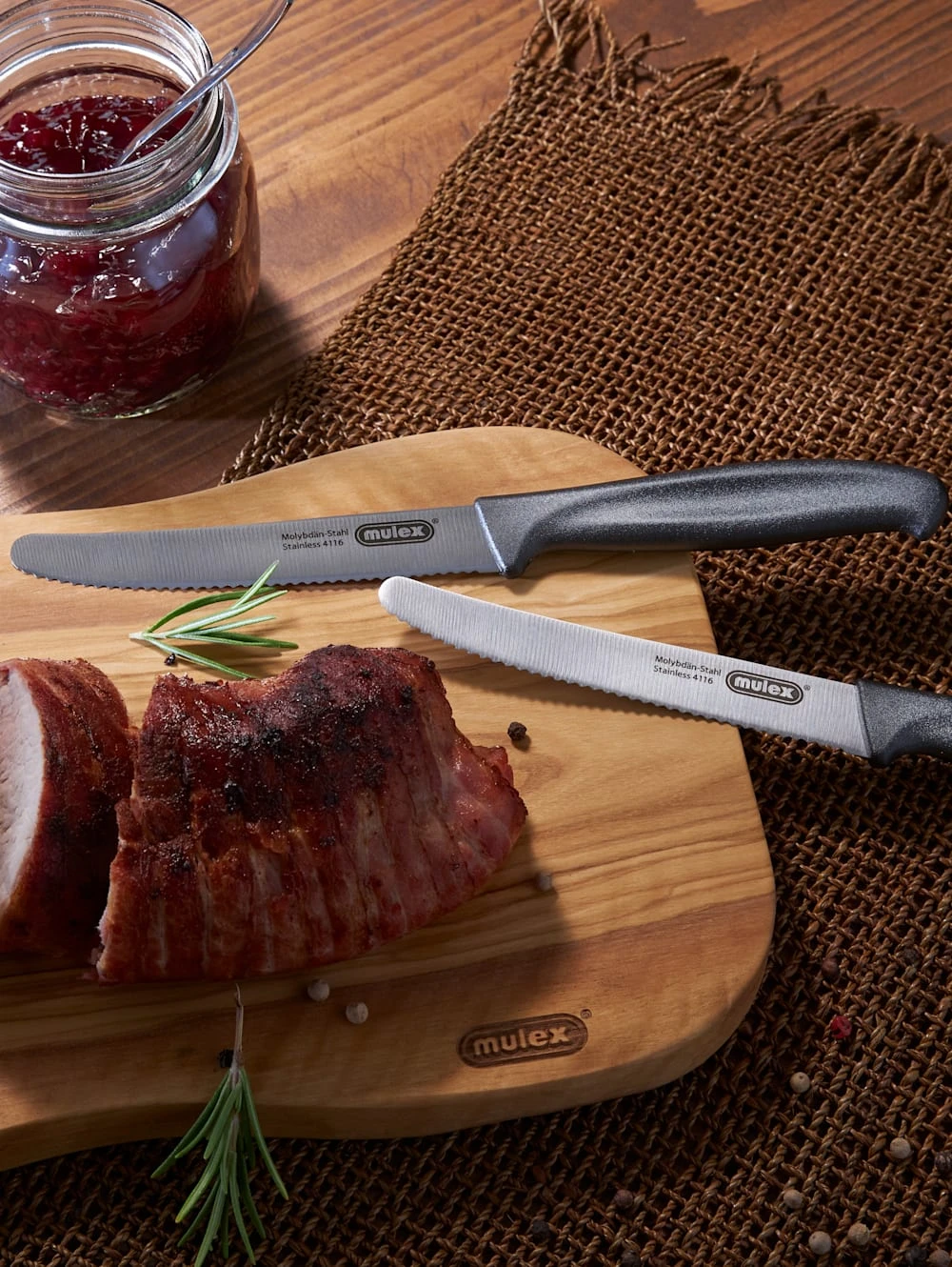 3tlg. Schneid- und Servierset TOSCANA. Bestehend aus Olivenholz-Schneidbrett sowie 2 extrascharfe Universal- Tafelmesser. Ein echter Hingucker für die Küche und auch für die Bewirtung Ihrer Gäste. Der warme Farbton des Olivenholzes und die interessante, marmorierte Maserung sorgen für einen wertigen Auftritt. Olivenholz ist ein sehr hartes Holz, härter als Eiche und Buche. Die hohe Resistenz verhindert schädlichen Schimmel – und lästigen Insektenbefall. Darüber hinaus ist Olivenholz geruchs- und fleckenabweisend. Ein natürliches Produkt mit individueller Note und Maserung – jedes Teil ist ein Unikat. Maße: ca. 29x 18 x 1,2 cm, extrem langlebig besonders schnittfest & messer- schonend, ein natürlich nachwachsender Rohstoff. Die Tafelmesser verfügen über eine hochwertige und extrascharfe Klinge aus Edelstahl rostfrei mit Wellenschliff sowie ergonomisch geformten Griff.