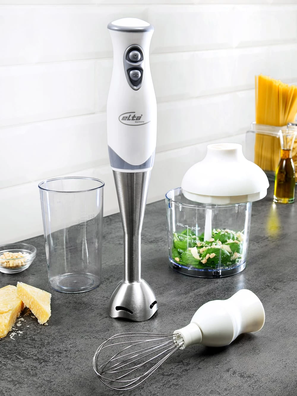 Stabmixer-Set ‚ESMS-200‘ von Elta zum Mixen, Pürieren, Schlagen, Hacken, Mahlen und Rühren. Auch ideal zur Zubereitung von Pestos, Desserts oder Dips. Der lange Edelstahlfuß mit scharfer Edelstahlklinge ist ideal zur Zubereitung in hohen Gefäßen oder auch zur Verarbeitung von heißen Lebensmitteln. Optimale Handhabung durch ergonomisches Design und 2 Schaltstufen. Mit dem Rührbesen-Aufsatz können Sie Schlagsahne, Eischnee usw. zubereiten. Der Zerkleinerer-Aufsatz eignet sich optimal zum Zerkleinern von Kräutern, Nüssen, Zwiebeln, Gemüse usw. Dank abnehmbarer Edelstahlklinge sorgt für eine einfache Reinigung. Max. 250 Watt. Das Set besteht aus Pürierstab, Rührbesen-Aufsatz, Universal-Zerkleinerer und Mixbecher.