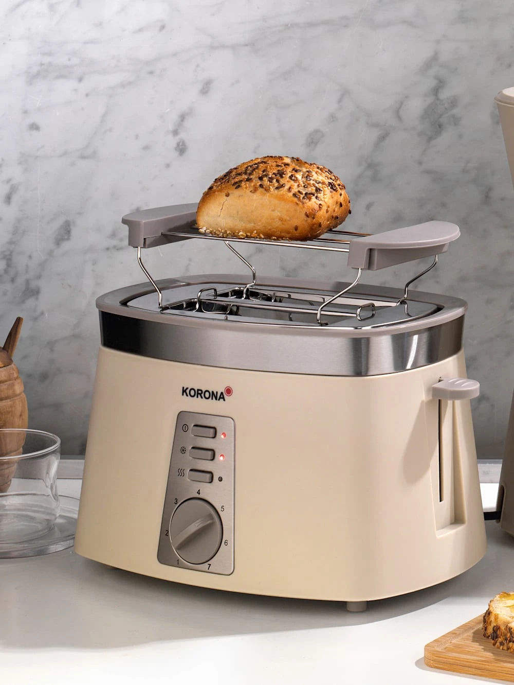 Korona Automatik-Toaster ‚21205‘ für 2 Brotscheiben. Mit stufenlos einstellbarem Bräunungsgrad – 7 Bräunungsgrade von leicht gebräunt bis knusprig. Die Brotscheibenzentierung sorgt für gleichmäßig gebräunte Toastscheiben. Zusätzlich verfügt der Toaster über eine Auftau-/und Aufwärm-Stufe sowie eine Stopp Taste mit der sich der Toastvorgang jederzeit unterbrechen lässt. Dank des abnehmbaren Brötchenaufsatzes lassen sich auch Brötchen uns Croissants aufbacken. Beleuchtete Funktionstasten. Automatische Abschaltung. Krümelschublade für einfach Reinigung. Wärmeisolierendes Gehäuse. 920 Watt (max.). Maße HxBxT ca.: 24 x 28,5 x 17 cm.