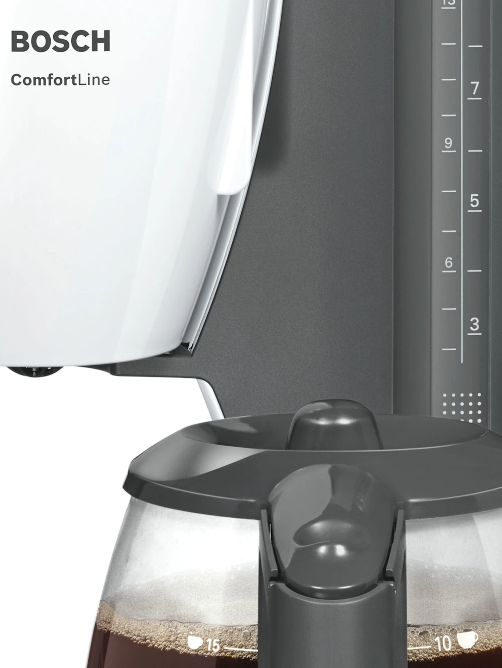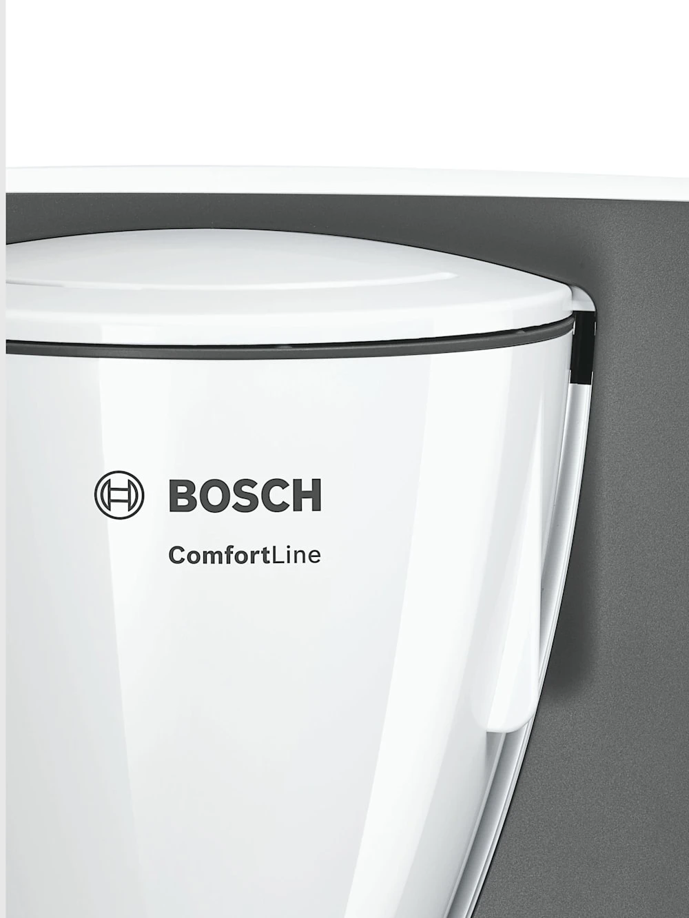 Bosch Filterkaffeemaschine ComfortLine TKA6A041 weiß/dunkelgrau. Was für ein schöner Morgen! Mit vollem Kaffeearoma und elegantem Design starten Sie gut gelaunt in den Tag! Aromaschutz-Glaskanne für 10/15 Tassen (1.25 l). Anschlusswert: 1000-1200 Watt. Aroma+ Taste für individuell wähl- bares Kaffeearoma. EasyDescale3: Entkalkungsprogramm, Entkalkungsanzeige, Wasserhärte einstellbar. Automatische Endabschaltung: 20, 40 oder 60 Minu- ten wählbar. Transparenter, abnehmbarer Wassertank mit integriertem Griff. Wasserstandsanzeige von außen ablesbar. Filterträger schwenk- und abnehm- bar (1×4). Tropfstopp. Easy storage: Kabelstaufach zur einfachen und schnellen Verstauung des Kabels. Gerätemaße HxBxT: 35,5×28,5×23 cm.