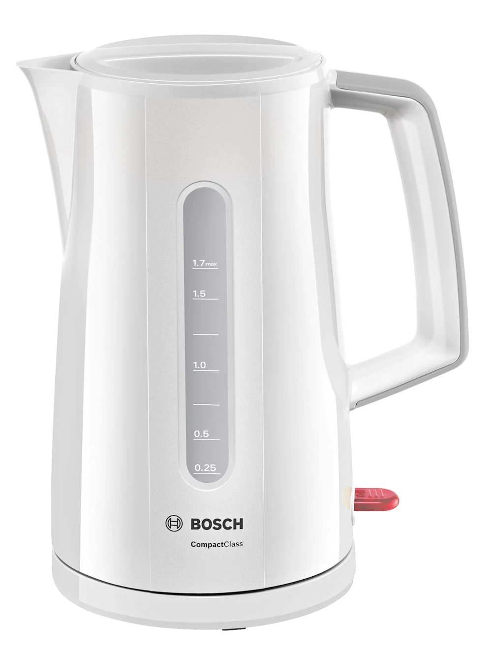 Wasserkocher Kompakt TWK3A014 für 1,7 Liter Wasser. Verdecktes Heizelement unter dem Edelstahlboden. Entnehmbarer Kalkfilter. Kabellos auf 360° drehbaren Basis. Wasserstandsanzeige außen beidseitig, auch für Linkshänder einfach ablesbar. Befüllung über den Ausgießer ohne Deckelöffnung möglich. Deckelverriegelung. Beleuchteter Ein-/Aus-Schalter. Automatische Abschaltung bei Erreichung des Kochpunktes. Abschaltung bei Wegnahme von der Basis. Trockengeh- und Überhitzungsschutz. Basis mit Anti-Rutsch-Füßen. Kabelaufwicklung. Max. 2.400 Watt.