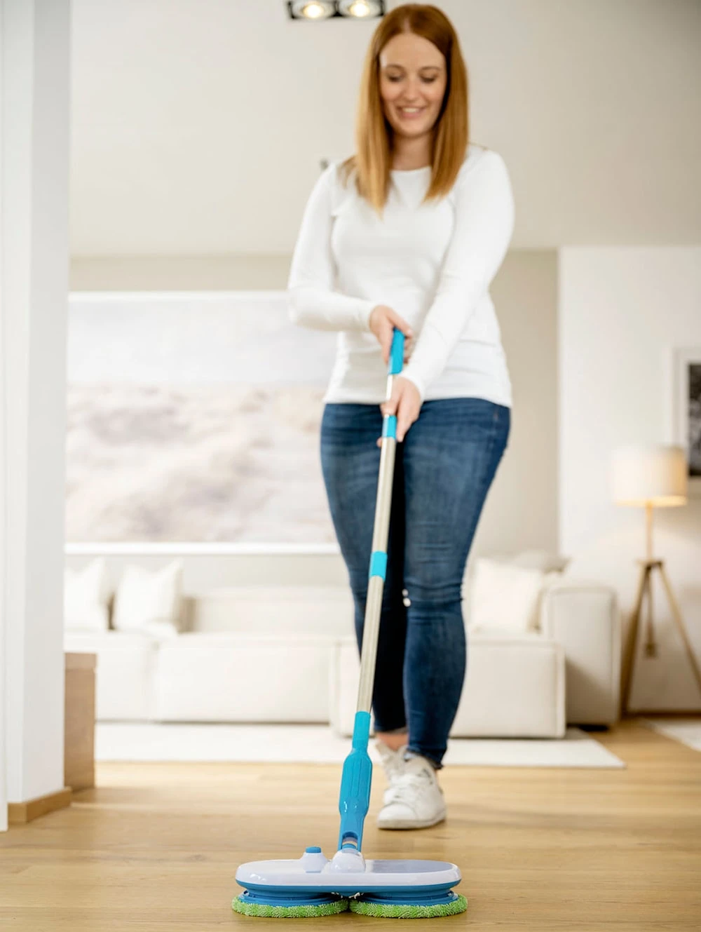 Kabelloser Akku-Wischmopp mit Doppel-Rotation ‚Hurricane Floating Mop‘. Das Original aus der TV-Werbung. Der Hurricane Flaoting Mop reinigt, schrubbt und poliert für Sie glatte Flächen mühelos. Mit 100 Rotationen/Minute säubert er Hartböden wie Fliesen, Parkett, Linoleum, Laminat, Vinyl aber auch empfindliche Oberflächen wie Duschwände, Badewanne, Fenster uvm. – dies bedeutet eine extreme Zeit- und Kraftersparnis für Sie. Das Gerät ist ist kabellos, wiederaufladbar, extrem flexibel und zudem vertikal sowie horizontal verwendbar. Sein schlankes Design ist ideal für schwer erreichbare Stellen und der Schwenkkopf putzt flexibel um jedes Hindernis herum. Zudem ist er extrem leicht und mit einer Hand zu bedienen. Dank dem Power-Akku mit 90 Minuten Reinigungsleistung reicht eine Akkuladung für das ganze Haus. Die speziellen, wiederverwendbaren Mikrofaserpads brechen mit tausend Fasern den Schmutz auf und schließen ihn sicher ein. Kabellänge 1,8 m. Inkl. 6 waschbare Reinigungspads: Scheuerpad (100% Polyester) für hartnäckigen Schmutz, Mikrofaserpad (80% Polyester, 20% Nylon) für normalen Schmutz und Polierpad (80% Polyester, 20% Nylon) zum Polieren von Böden und Oberflächen – jeweils 2 Stück mit Ø 15,5 cm. Maße des Mopps LxBxH ca.: 15 x 31 x 123 cm.