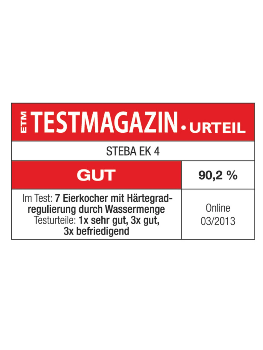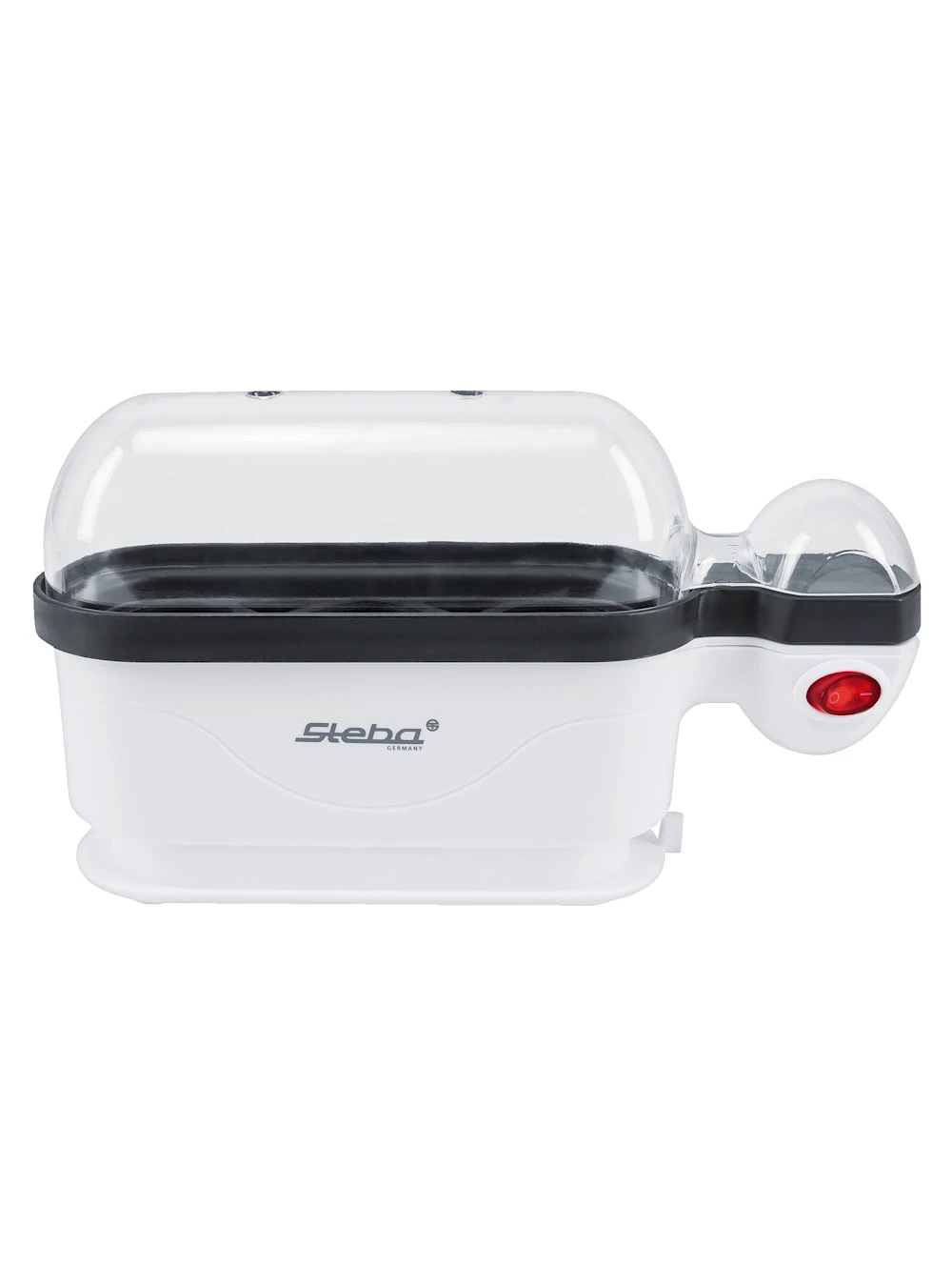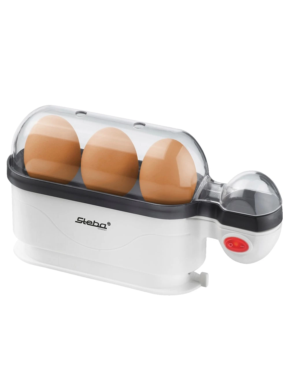 Steba Eierkocher für 3 Eier EK 4 weiß. Der Eierkocher EK 4 von Steba ist ideal für das perfekte Frühstücksei. Einfach 3 Eier anpicken und die entsprechende Menge Wasser mit dem mitgelieferten Messbecher und Eierpick abmessen. Das Endsignal gibt bescheid sobald die Eier fertig sind und bereitet Ihnen keine weiter Arbeit. Der praktische Ein-/Ausschalter, die antihaftbeschichteter Kochschale und der Eierträger mit Tragegriff machen das Bedienen zum Kinderspiel. Gerätemaße HxBxT: 13 x 23 x 7 cm. Leistung 350 Watt.