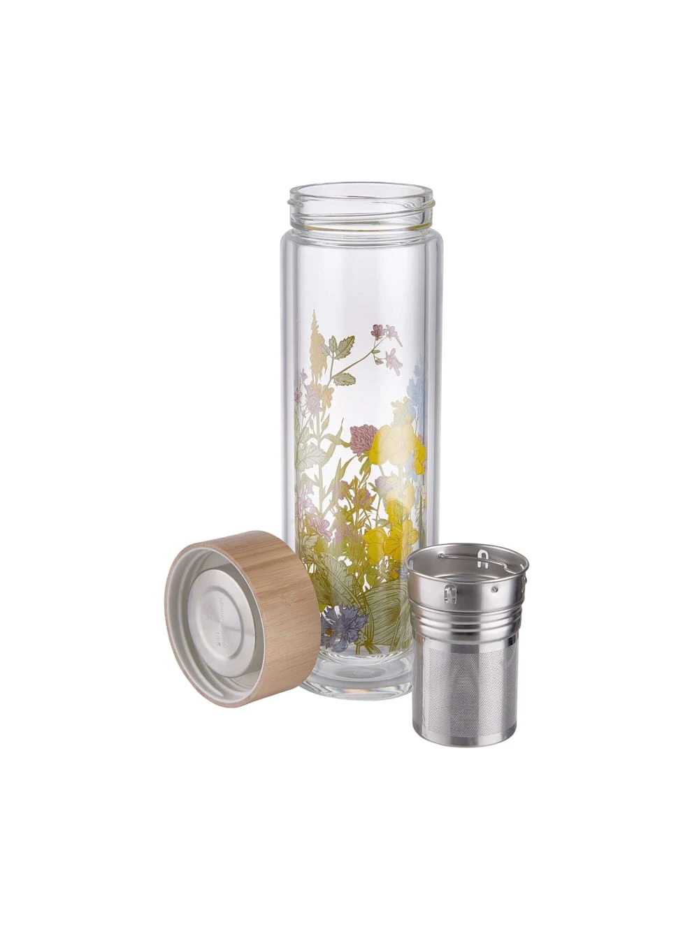 Tea to go in seiner schönsten Form: Die designige Tea Tender Teeflasche mit Blumendruck aus robusten Borosilikatglas bringt mit Edelstahlsieb und Holzverschluss alles mit, was Sie für die Zubereitung und den Transport Ihres Lieblings-Tees oder Infused Waters brauchen.