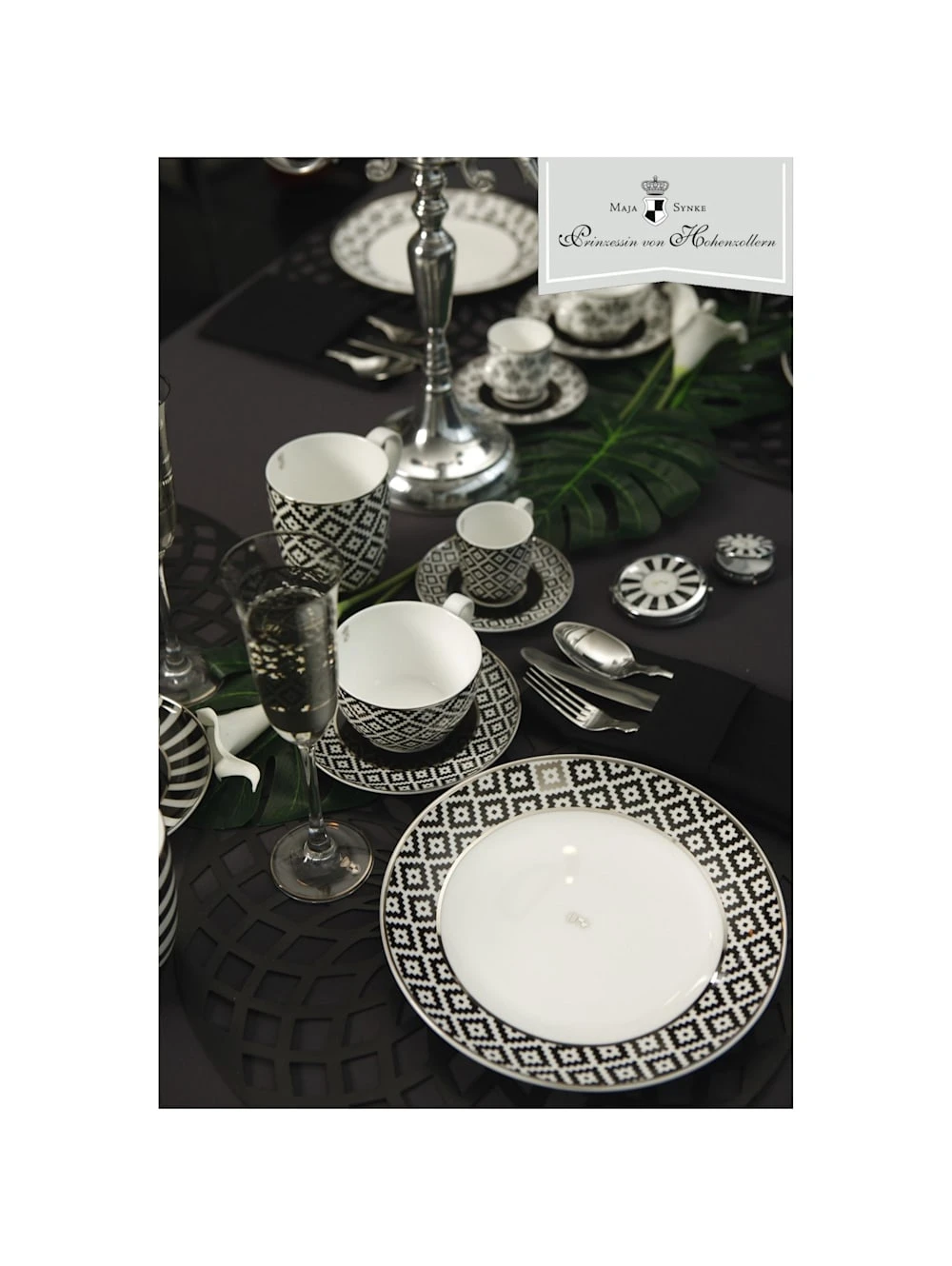 Dessertteller – Diamonds by Maja Prinzessin von Hohenzollern Der Traum vieler Frauen „Leben wie eine Prinzessin!“ im jungen, royalen und vornehm trendigen Design Um die Brillanz der Farben und die Platinauflage zu schonen, ist Spülen per Hand mit mildem Reinigungsmittel empfehlenswert.Der schwarz-weiße Wohntrend ist zeitlos und doch modern und wirkt dabei elegant und stylisch. Die Schwarz /Weiß – Serie von Prinzessin Maja von Hohenzollern by Goebel setzt Akzente im Bereich Geschenk und Wohnen mit schwarzen oder schwarz/weiß ornamentierten Accessoires wie Kissen, Vasen, Tassen und Tellern und anderer Dekoration. Die schwarzen Kontraste lenken das Auge. Der Tupfen Gold/Silber, der in den Entwürfen immer wieder auftaucht ist ein edler Hingucker und royaler Akzent.I.H. Maja Prinzessin von Hohenzollern ist nicht nur das heutzutage wohl international bekannteste Mitglied der königlichen Familie von Hohenzollern. Neben modernen Interior- Designs entwirft sie auch Produkte für Kinder und Tiere. I.H. Maja Prinzessin von Hohenzollern ist eine große Tierfreundin und setzt sich weltweit engagiert für den Tierschutz ein. Die Lizenzmarke „Maja Prinzessin von Hohenzollern“ steht für ein junges, royales und trendiges Design. Sie transportiert das Lebensgefühl und den Lifestyle einer modernen Prinzessin von heute.