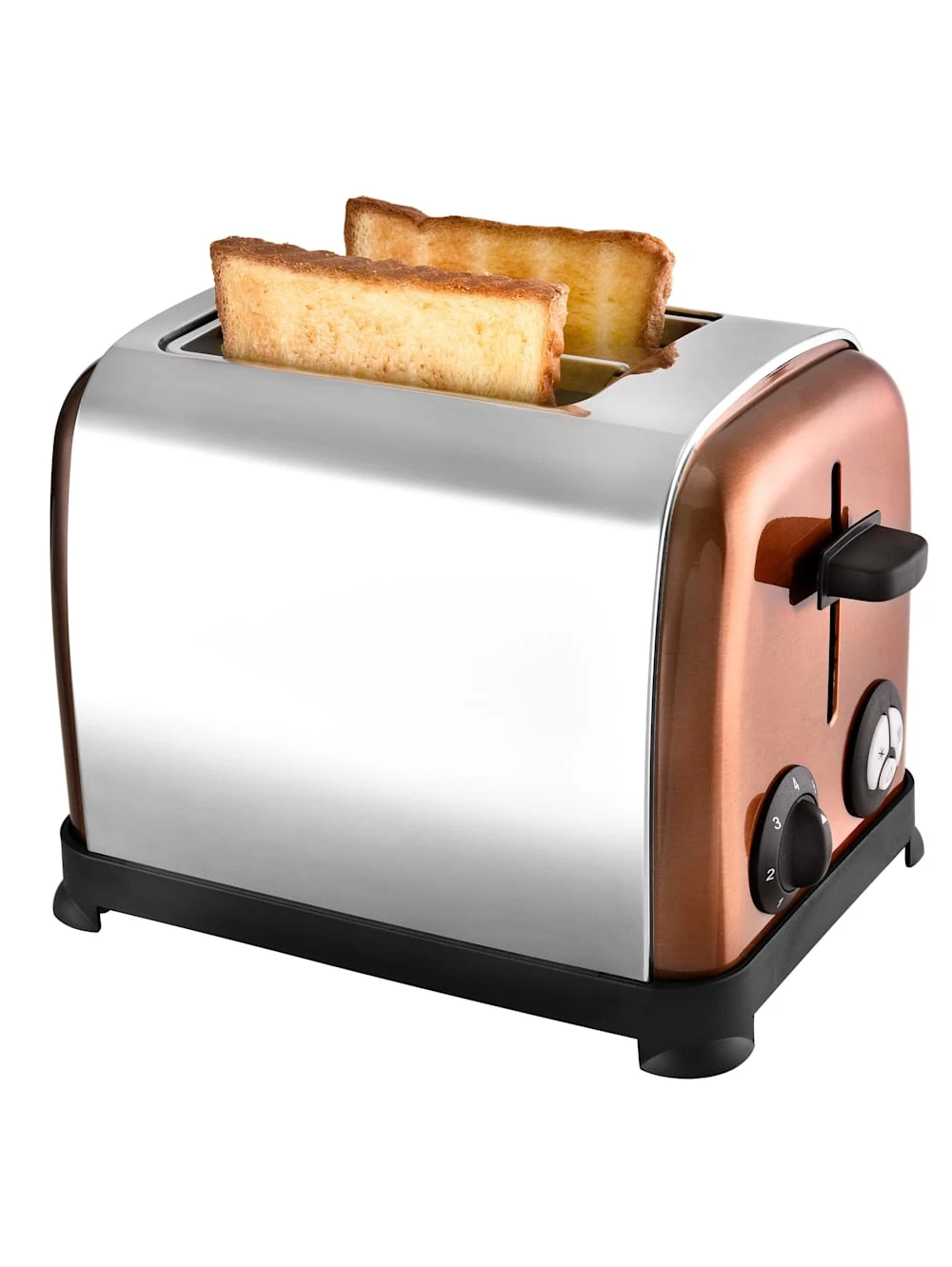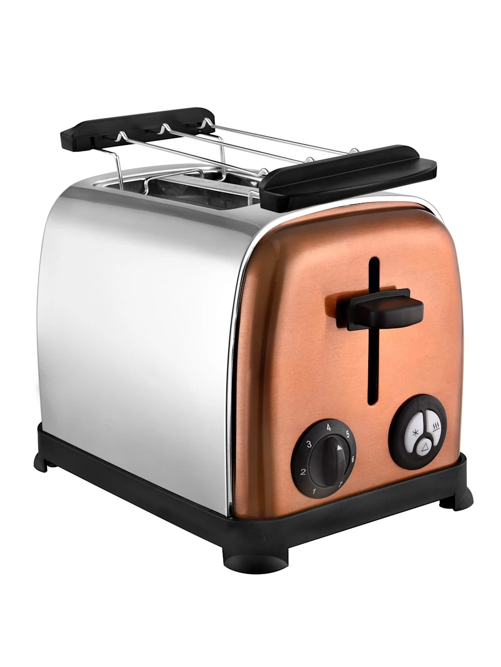 KALORIK Toaster mit Bötchenaufsatz KUPFER. Design-Toaster für 2 Scheiben Toast ( extra breit ), Toastlift, Auftaufunktion, Stopp-Taste, Brötchenaufsatz, Krümelschublade, 800 Watt. Gerätemaße: H/B/T 240 x 296 x 180 mm. Material: Edelstahl, Kunststoff.