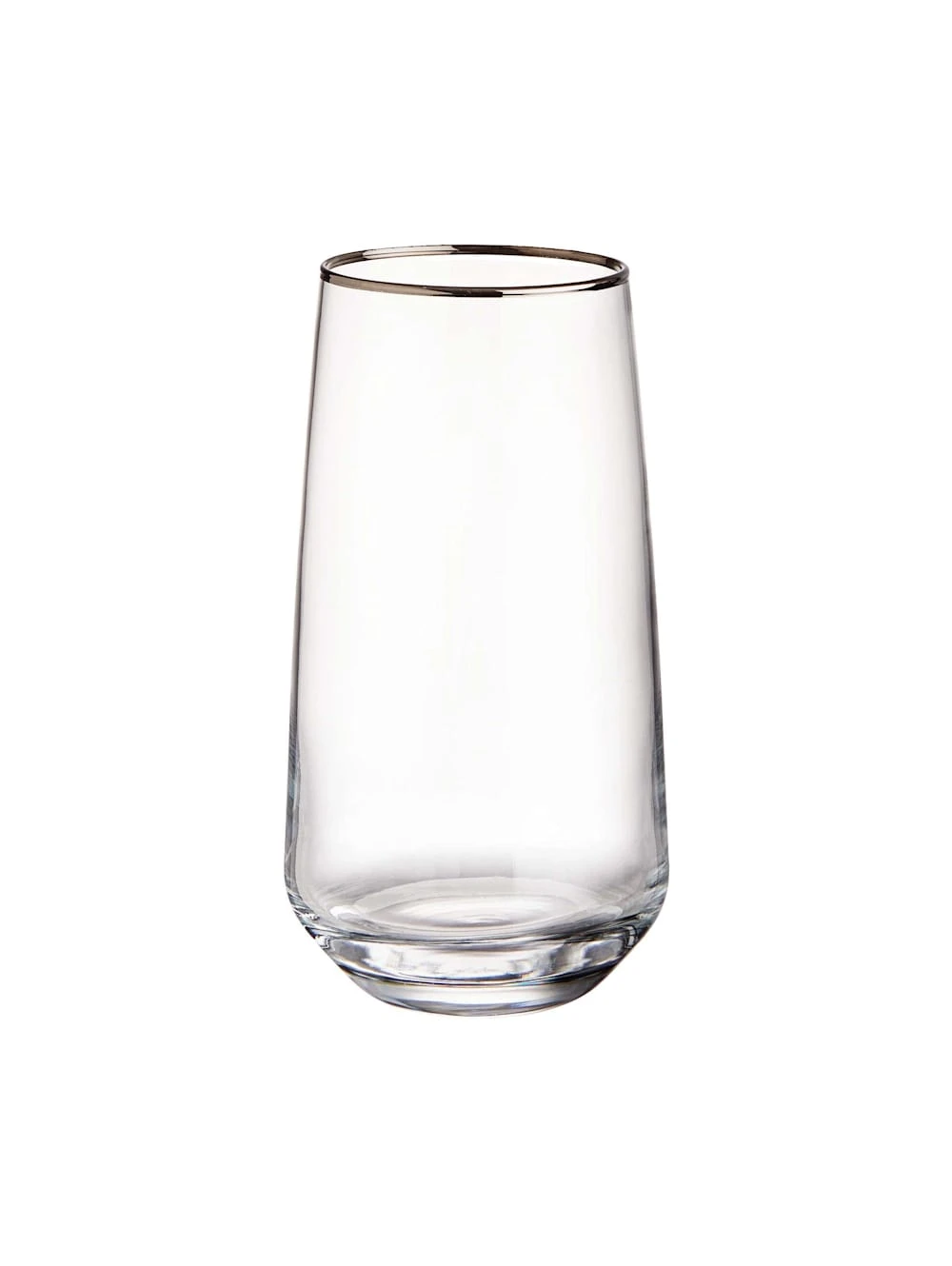 Da passt was rein: In unserem modernen Touch of Silver Longdrinkglas 480 ml im 6er-Set haben auch großzügig eingeschenkte Longdrinks Platz – inklusive einer ordentlichen Portion Eiswürfel. Da sitzen Sie und Ihre Gäste beim Essen und Feiern nicht so schnell auf dem Trockenen. Passendes Wasserglas erhältlich.