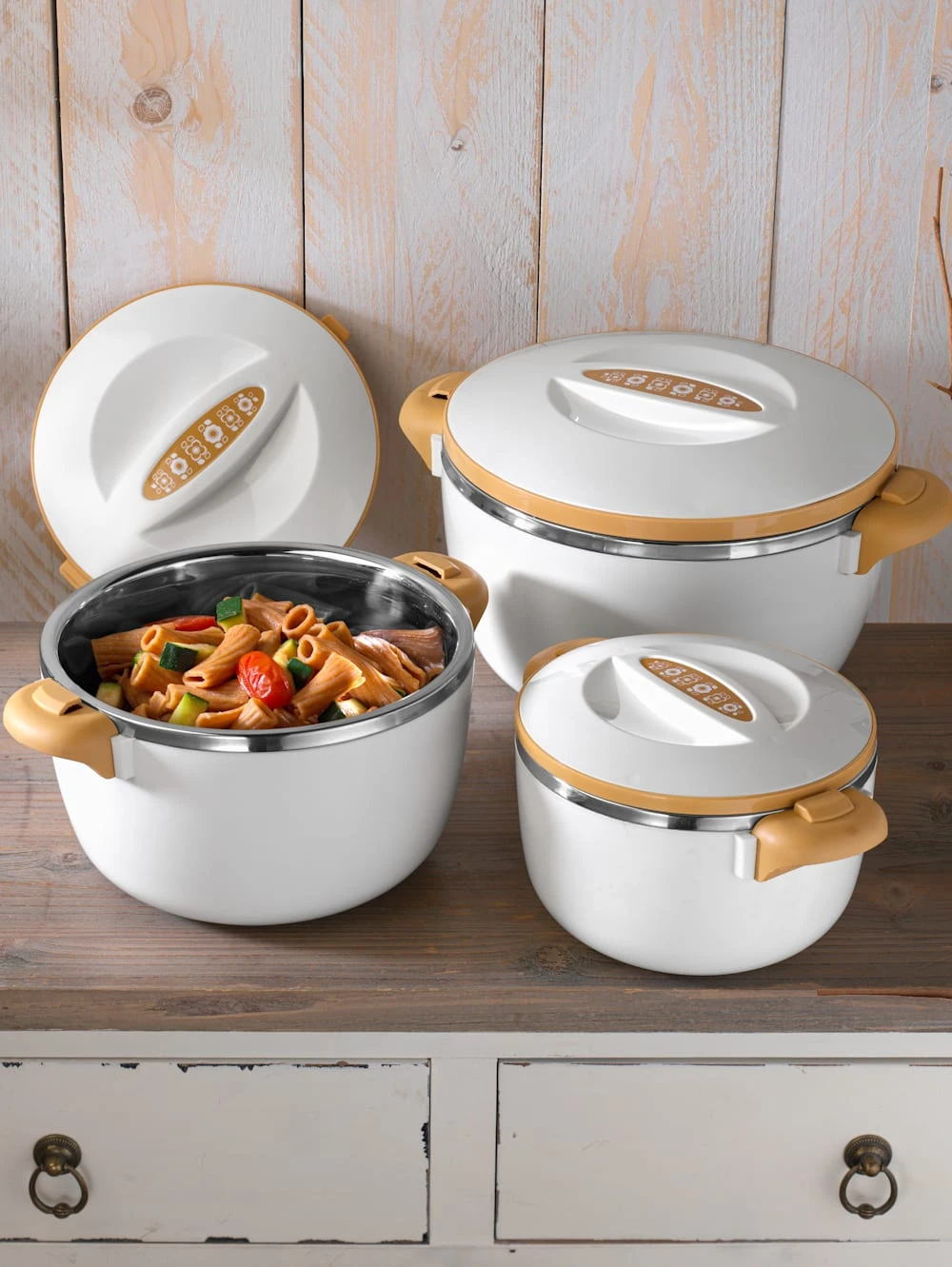 Warmhalte-Schüssel. Diese Warmhalte-Schüssel hält durch ihren Thermo-Effekt die Speisen stundenlang warm bzw. kalt. Mit dicht schließendem Deckel, daher auch zum Mitnehmen ins Büro oder für unterwegs. Aus stabilem Kunststoff mit Edelstahl-Einsatz. Fassungsvermögen 3,6 Liter. Maße LxBxH ca. 31 x 24 x 17 cm.