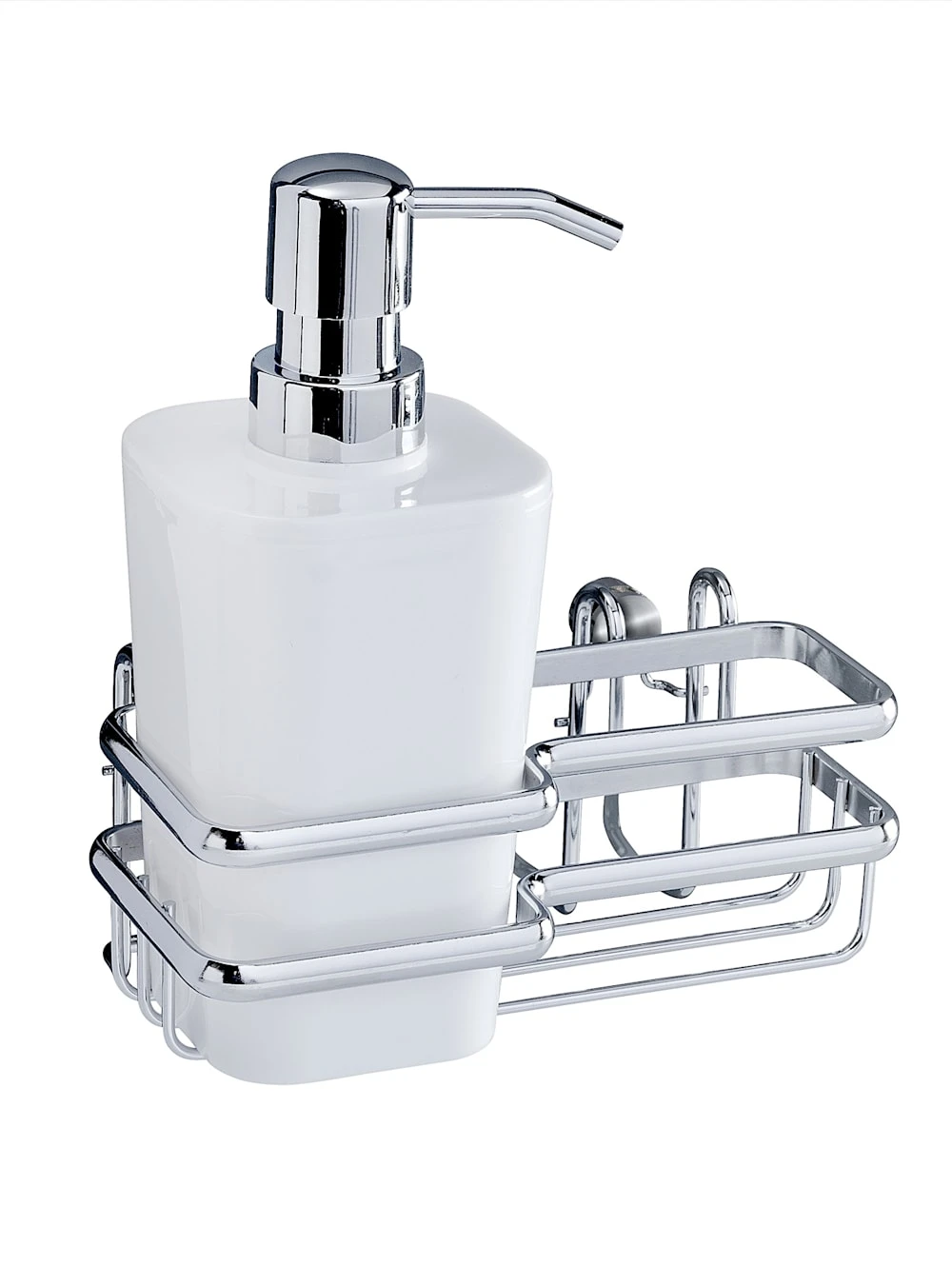 Allzeit einsatzbereit. Mit dem eleganten Spül-Set ‚Turbo Loc‘ wird das Spülen zum freudigen Erlebnis. Ideal zur Aufbewahrung für Ihre Spülutensilien. Mit herausnehmbarem, leicht zu befüllenden Spülmittelspender und Schwamm (im Lieferumfang enthalten). Der Spender kann je nach Wunsch auch mit Flüssigseife oder Waschlotion befüllt werden. Platzsparend an der Wand anzubringen mittels Spezial-Klebepad-System ‚Turbo Loc‘. Es ermöglicht eine schnelle und problemlose Befestigung ohne Bohren. Extrem fester Halt auf allen glatten und leicht strukturierten Oberflächen. Rückstandslos wieder zu entfernen. Gestell aus Edelstahl rostfrei, Spender aus Kunststoff. Maße HxBxT ca.: 6 x 16 x 7 cm.